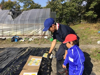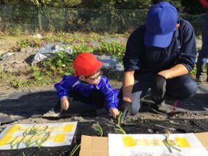 学部を超えた協働学習(タマネギ苗の定植) Posted on 2025 年 11 月 20 日 by seibiyo01 A高等部農耕班の生徒にA小学部2年生の児童がタマネギの苗の植え方を教えてもらいました。 A高等部の生徒は、やさしく丁寧に苗の定植の仕方を教えたり、一緒に植えたりしました。A小学部の児童は、お兄さん達と楽しく定植をすることができました。