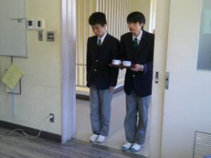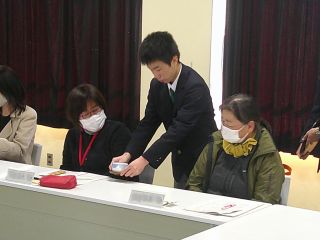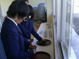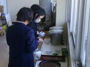 学校運営協議会の休憩時間に、高等部3年生が接遇を行いました。おもてなしの心をもって、丁寧な所作でお茶を入れたり運んだりすることができました。