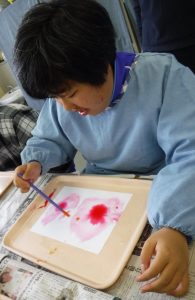 火曜日の午後は、美術の授業です。「にじみたらし」に挑戦しました。