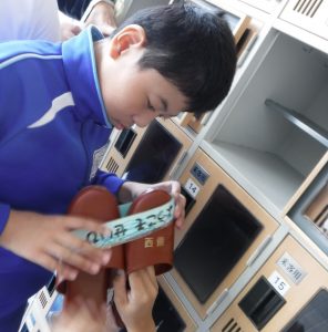 せいびタイムの時間に、室内グループでお客さんのスリッパを止める帯を新しく作りました。みんなで丁寧に作りました。