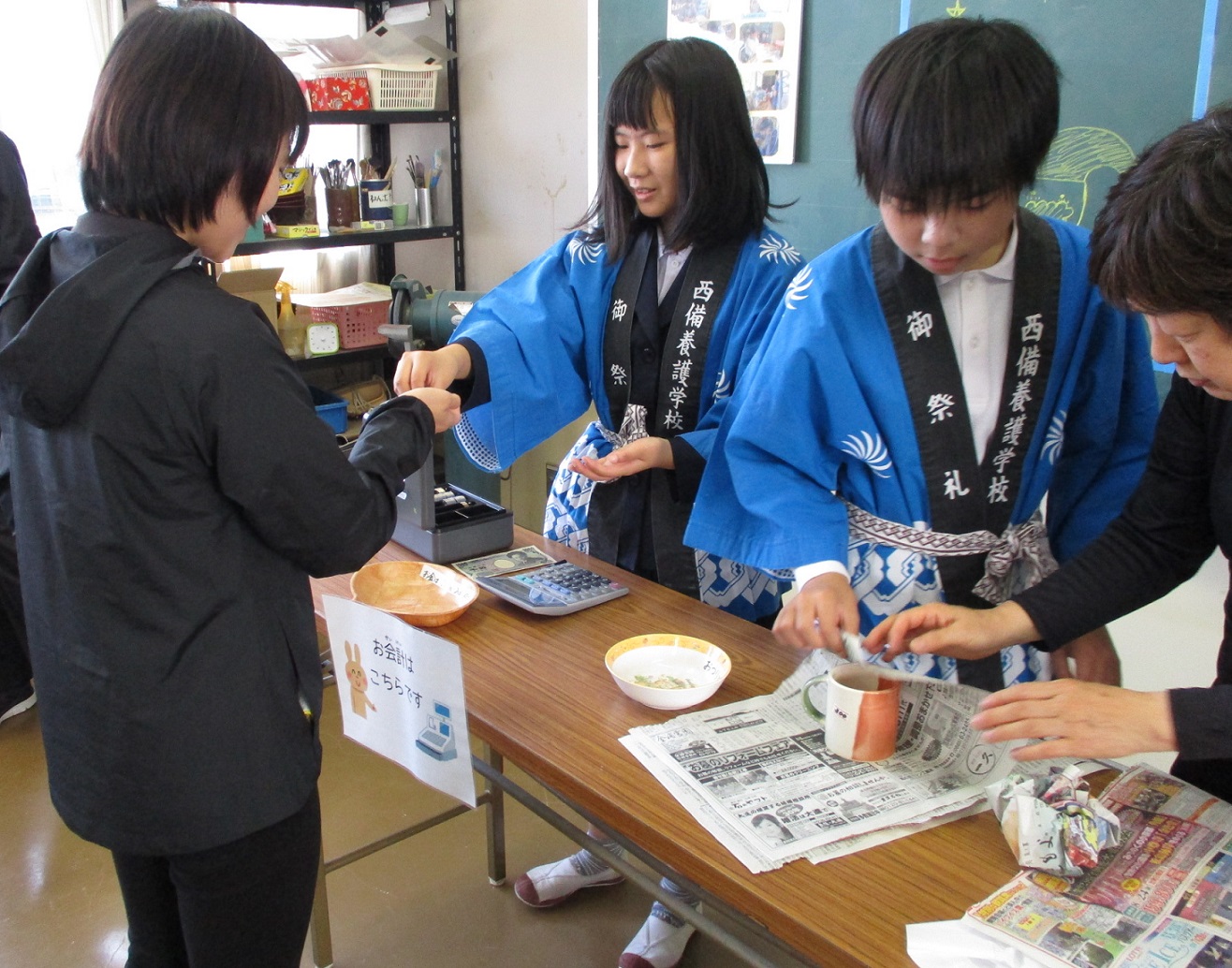 午後からは、作業学習で育てたり、製作したりした商品の販売を行いました。「いらっしゃいませ。」「ありがとうございました。」と活気ある販売活動をすることができました。お買い上げくださった方々、ありがとうございました。