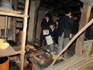 当日は、博物館の中でも草戸千軒(くさどせんげん)遺跡を中心に説明をしてくださいました。着衣体験に生徒たちは大喜び。今から700年前の鎌倉・室町時代にタイムスリップしたようでした。交易や市について、下駄屋さんや漆屋さんなど、人々の生活について当時を再現したセットでたくさんのことを学ぶことができました。