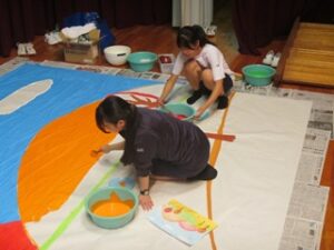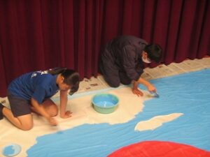 写真は畑の整備や水やり、学習発表会(せいび祭)のステージ発表で使う背景の作成の様子です。