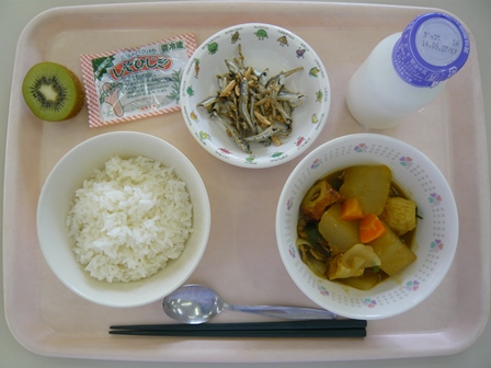 9月18日(木) 献立 Posted on 2014 年 9 月 18 日 by seibi10 ごはん 牛乳 冬瓜のカレー煮 小魚アーモンド キウイフルーツ しそひじき 野菜がごろごろ入ったカレー煮を食べると、実りの秋を感じました! しそひじきをかけて、ごはんがすすみました♪