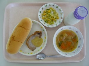 パン 牛乳 豚肉のりんごソースかけ キャベツソテー コンソメスープ