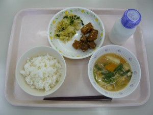4月21日(木)献立 Posted on 2016 年 4 月 21 日 by seibiyo01 ごはん 牛乳 かつおのピーナッツがらめ 小松菜のごま和え にら入りみそ汁 かつおに砂糖・みりん・しょう油・酒で作ったタレと 千葉県産のピーナッツをからめました。